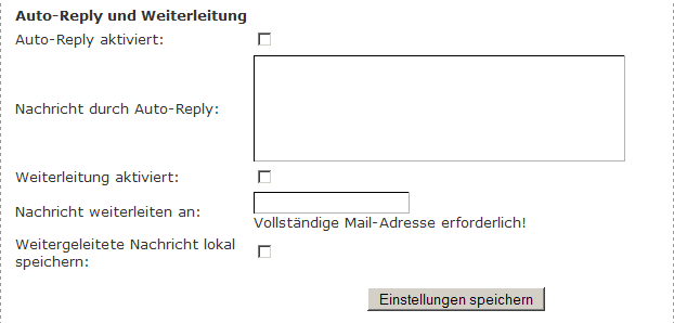 Die Weiterleitung leitet jede eingehende Email an die angegebene Adresse weiter. Falls eine Kopie der Mail im normalen Postfach beibehalten werden soll, ist das Häkchen bei "Weitergeleitete Nachricht lokal speichern" zu setzen. Diese Funktion verwendet man, um z.B. während des Urlaubs seine Mails an einen anderen weiterzuleiten, oder wenn diese Mail-Adresse grundsätzlich an einen anderen Account weitergeleitet werden soll.